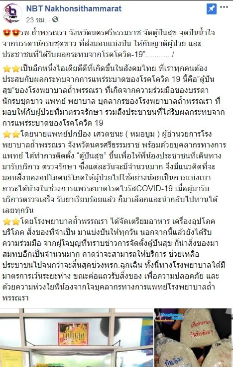 20 พฤษภาคม 2563 เฟสบุ๊คเพจ NBT Nakhonsithammarat ได้โพสเรื่องราวสุดประทับใจ ของเหล่านักรบชุดกาว โดยมีรายละเอียดดังนี้