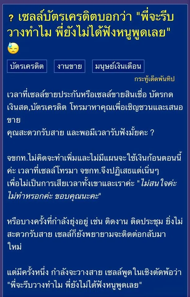 "พี่จะรีบวางทำไม พี่ยังไม่ได้ฟังหนูพูดเลย" เซลล์พูดตัดพ้อหลังลูกค้ากำลังจะวางสาย