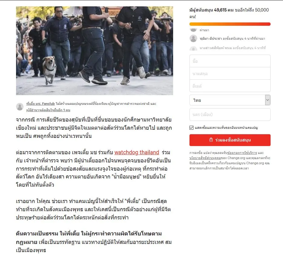 เว็บไซต์ www.change.org ผู้ใช้ชื่อ พี่เตี้ย มช. Fanclub ได้สร้างแคมเปญรณรงค์ คืนความเป็นธรรมให้ พี่เตี้ย มช. โดยมีรายละเอียดดังนี้