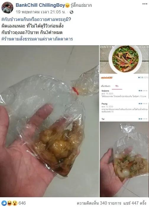 เมื่อวันที่ 19 พฤษภาคม 2563 ผู้ใช้เฟสบุ๊ค BankChill ChillingBoy ได้โพสภาพ แกงถุง ราคา 70 บาท กิน 3 คำหมด ชมภาพ