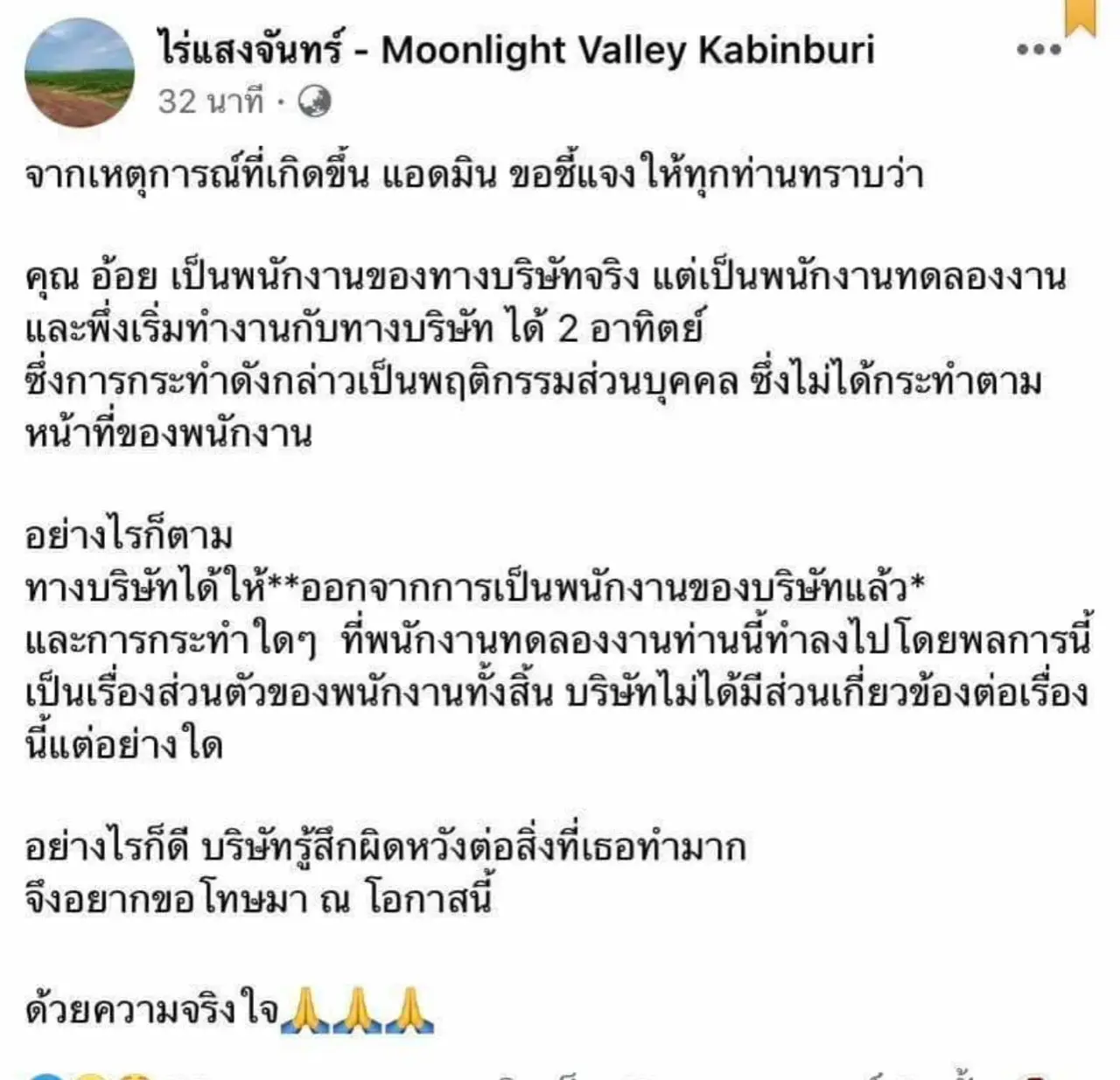 ล่าสุดเพจเฟซบุ๊ก ไร่แสงจันทร์ - Moonlight Valley Kabinburi ได้ชี้แจง กรณีสาวที่อุ้มสุนัขว่า "จากเหตุการณ์ที่เกิดขึ้น ... ขอชี้แจงให้ทุกท่านทราบว่า คุณ อ้อย เป็นพนักงานของทางบริษัทจริง แต่เป็นพนักงานทดลองงาน และพึ่งเริ่มทำงานกับทางบริษัท ได้ 2 อาทิตย์ ซึ่งการกระทำดังกล่าวเป็นพฤติกรรมส่วนบุคคล ซึ่งไม่ได้กระทำตามหน้าที่ของพนักงาน อย่างไรก็ตาม ทางบริษัทได้ให้**ออกจากการเป็นพนักงานของบริษัทแล้ว* และการกระทำใดๆ ที่พนักงานทดลองงานท่านนี้ทำลงไปโดยพลการนี้ เป็นเรื่องส่วนตัวของพนักงานทั้งสิ้น บริษัทไม่ได้มีส่วนเกี่ยวข้องต่อเรื่องนี้แต่อย่างใด อย่างไรก็ดี บริษัทรู้สึกผิดหวังต่อสิ่งที่เธอทำมาก จึงอยากขอโทษมา ณ โอกาสนี้ ด้วยความจริงใจ