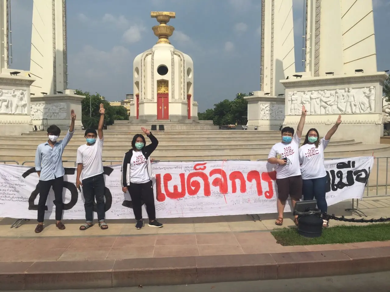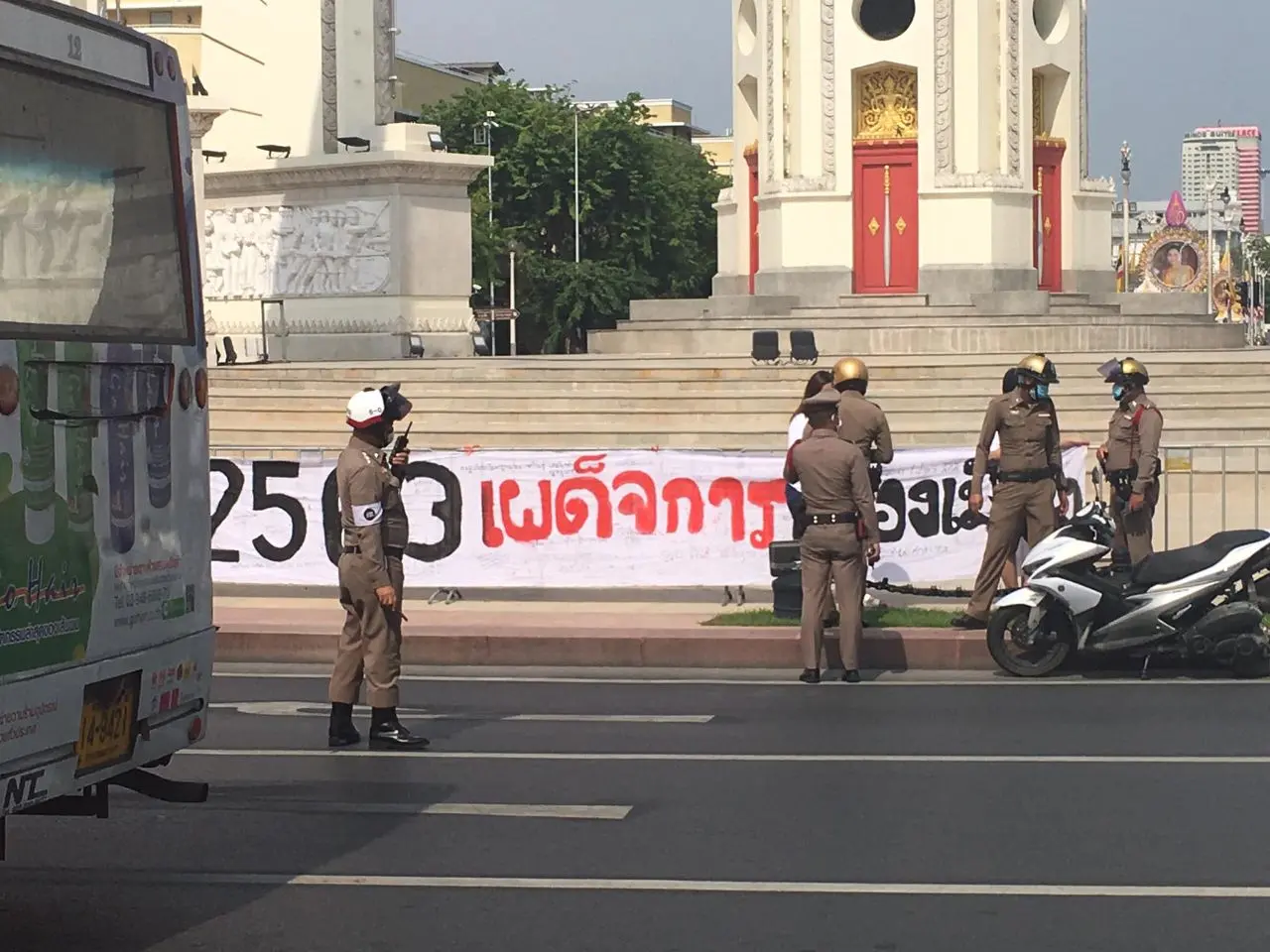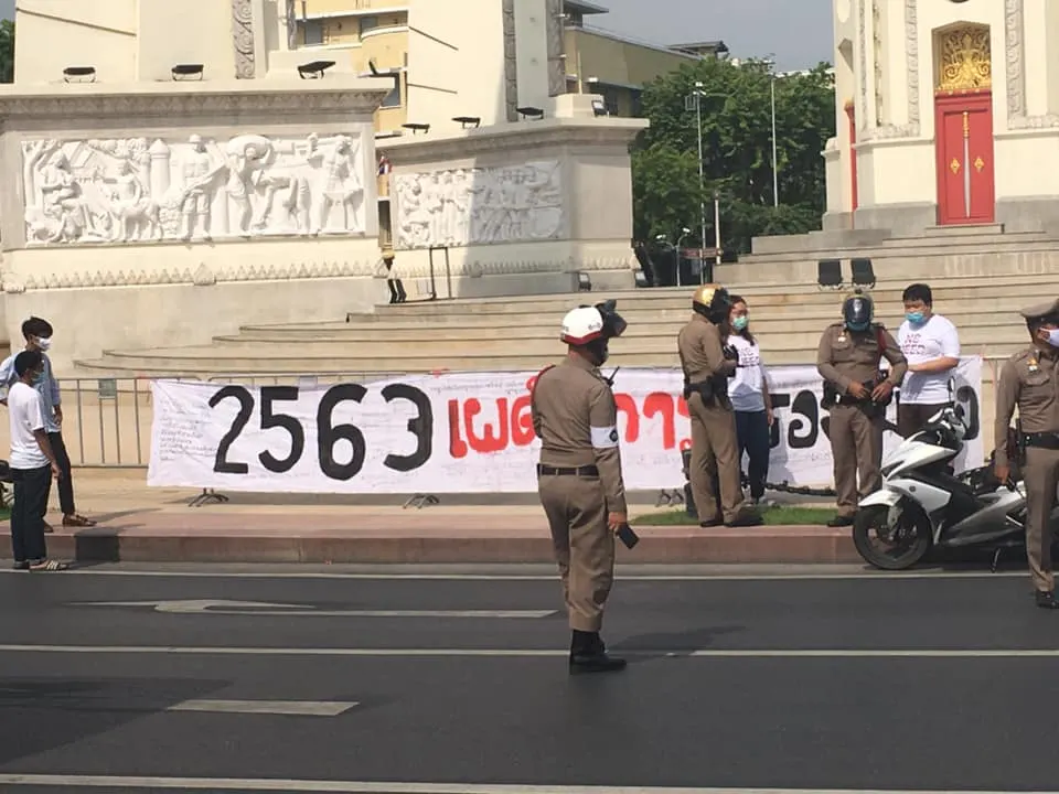 ล่าสุดป้ายผ้าของสนท. ที่ถูกนำไปติดที่บริเวณอนุสาวรีย์รัฐธรรมนูญ โดนตำรวจล้อมแล้ว เนื่องจากอ้างว่าผิด พ.ร.ก. ฉุกเฉิน
