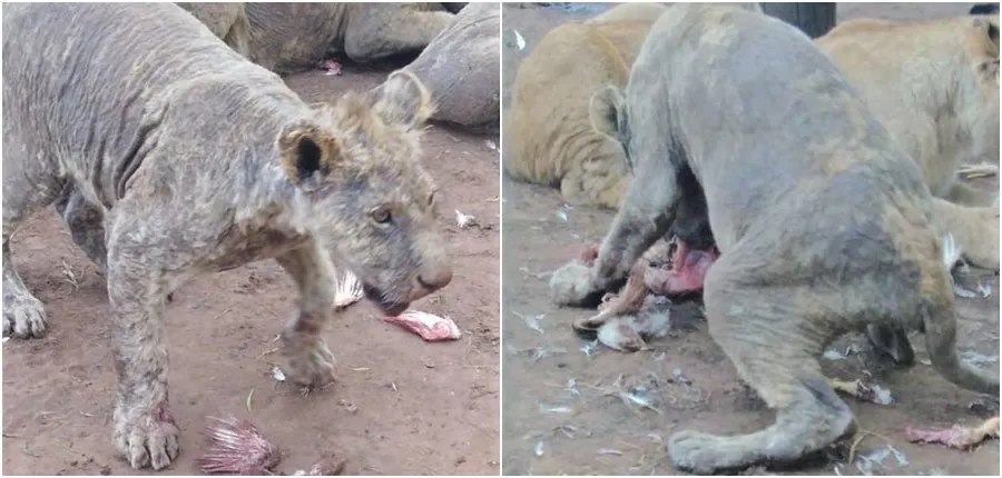 จากภาพที่ถูกนำมาเผยแพร่จะเห็นได้ชัดว่า สิงโตกำลังเผชิญกับอาการเจ็บป่วยอย่างรุนแรง แทบจะทุกตัวขนได้หลุดร่วงไปเกือบทั้งหมด ซึ่งน่าจะเป็นผลมาจากโรคที่เรียกว่า โรคเรื้อนของสุนัข