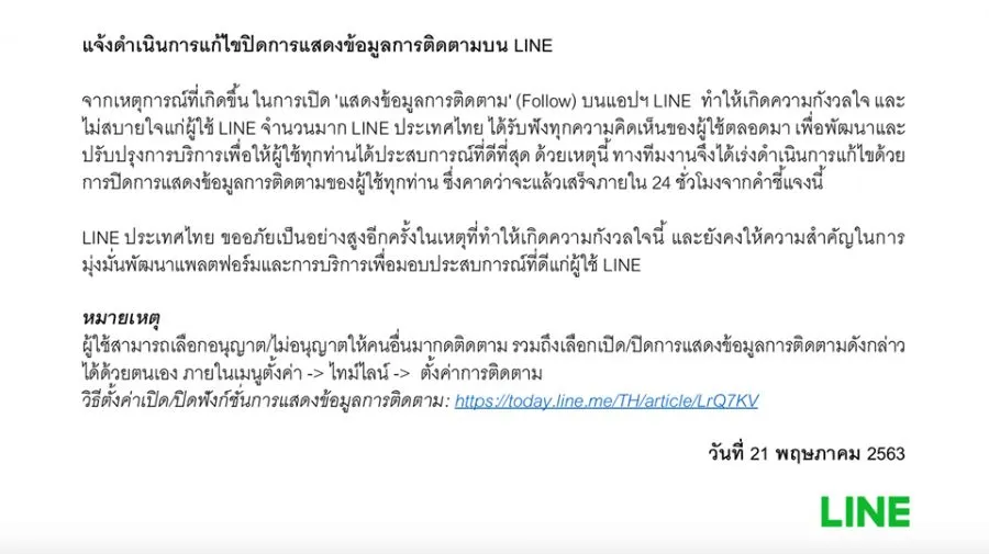 ล่าสุด เมื่อวันที่ 21 พฤษภาคม 2563 เฟซบุ๊ก LINE Thailand - Official ได้ออกมาชี้แจง ระบุว่า LINE ประเทศไทย ได้ดำเนินการแก้ไขปิดการแสดงข้อมูลการติดตามบน LINE จากเหตุการณ์ที่เกิดขึ้นในการเปิด "แสดงข้อมูลการติดตาม" (Follow) บนแอปฯ ซึ่งคาดว่าจะแล้วเสร็จภายใน 24 ชั่วโมง โดยระบุว่า