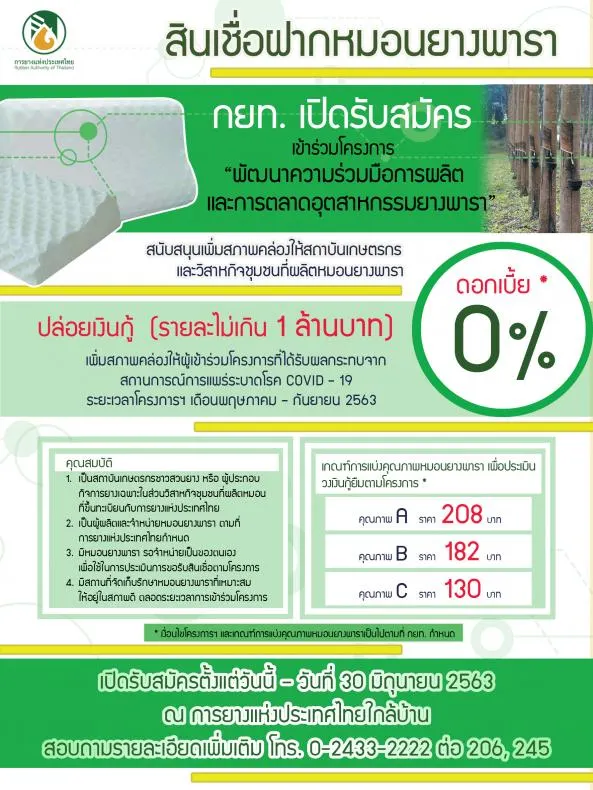 จากสถานการณ์การแพร่ระบาดของโรคไวรัสโคโรน่า 2019 (COVID-19) ส่งผลให้ภาคการผลิต การตลาด และการส่งออกหยุดชะงักไป รวมถึงกลุ่มผู้ผลิตหมอนยางพารา ซึ่งได้รับผลกระทบเนื่องจากประเทศจีนซึ่งเป็นลูกค้ารายสำคัญชะลอการท่องเที่ยวในประเทศไทยและการสั่งซื้อหมอนยางพารา จึงจัดทำโครงการพัฒนาความร่วมมือการผลิตและการตลาดอุตสาหกรรมยางพารา (สินเชื่อฝากหมอนยางพารา) ให้กับสถาบันเกษตรกรชาวสวนยาง วิสาหกิจชุมชนผู้ผลิตหมอนยางพาราที่ขึ้นทะเบียนกับ กยท. เพื่อเพิ่มสภาพคล่อง ขยายกำลังการผลิต และส่งเสริมสนับสนุนให้มีการใช้ยางภายในประเทศ โดยการแปรรูปยางเพื่อเพิ่มมูลค่า รวมถึงเพิ่มช่องทางจำหน่ายยางให้มากขึ้น ซึ่ง กยท. จะปล่อยสินเชื่อปลอดดอกเบี้ย ให้กับสถาบันเกษตรกรชาวสวนยางหรือวิสาหกิจชุมชน ที่ได้รับการอนุมัติวงเงินตามปริมาณสต๊อกหมอนยางที่มี โดยใช้เกณฑ์คุณภาพหมอนยางพารามาทำการประเมินราคากำหนดวงเงินสินเชื่อแบ่งเป็นเกรด A วงเงินสูงสุด 80% เกรด B วงเงินสูงสุด 70% และ เกรด C วงเงินสูงสุด 50% ของมูลค่าหมอนยางตามที่ กยท.กำหนด ซึ่งจะมีคณะกรรมการเข้าตรวจสอบสินค้าตามเกณฑ์การประเมินของโครงการ โดยผู้เข้าร่วมโครงการจะต้องมีสต๊อกหมอนยางพาราเป็นของตนเอง เพื่อใช้ในการประเมินสินเชื่อ และค้ำประกัน อีกทั้งต้องมีสถานที่จัดเก็บที่เหมาะสมตลอดระยะเวลาที่เข้าร่วมโครงการ และเมื่อผู้เข้าร่วมโครงการจำหน่ายหมอนยางพาราได้ หรือมีความพร้อมในการคืนเงิน สามารถชำระเงินคืนให้กับ กยท. ได้ตลอดระยะเวลาโครงการ ซึ่งจะสิ้นสุดในเดือนกันยายน 2563 ภายใต้งบประมาณตลอดโครงการ 11,312,000 บาท