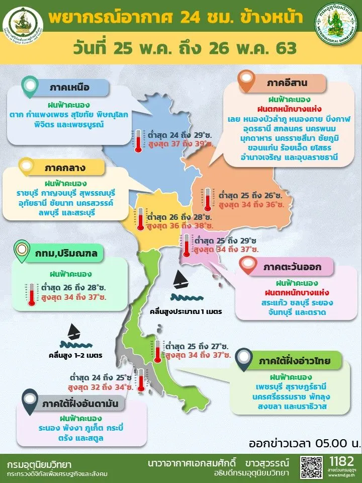 พยากรณ์อากาศประจำวันที่ 25 พฤษภาคม 2563 พยากรณ์อากาศ 24 ชั่วโมงข้างหน้า มรสุมตะวันตกเฉียงใต้พัดปกคลุมทะเลอันดามันและประเทศไทย ประกอบกับมีหย่อมความกดอากาศต่ำปกคลุมประเทศลาวตอนบน ทำให้ประเทศไทยมีฝนฟ้าคะนองในระยะนี้ โดยมีฝนตกหนักบริเวณภาคตะวันออกเฉียงเหนือ ภาคตะวันออก และภาคใต้ฝั่งตะวันตก ขอให้ประชาชนบริเวณดังกล่าวระวังอันตรายจากฝนที่ตกหนักและฝนที่ตกสะสม สำหรับบริเวณทะเลอันดามันทะเลมีคลื่นสูง 1-2 เมตร บริเวณที่มีฝนฟ้าคะนองคลื่นสูงมากกว่า 2 เมตร ขอให้ชาวเรือบริเวณทะเลอันดามันเดินเรือด้วยความระมัดระวัง