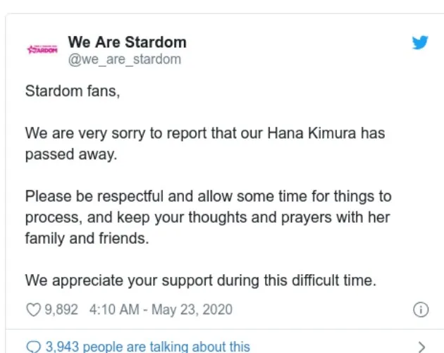 23 พ.ค. 63 เพจ บ้ามวยปล้ำ โพสต์เรื่องราวสลดใจ Hana Kimura นักมวยปล้ำของ STARDOM ได้เสียชีวิตแล้วในวันนี้ใน