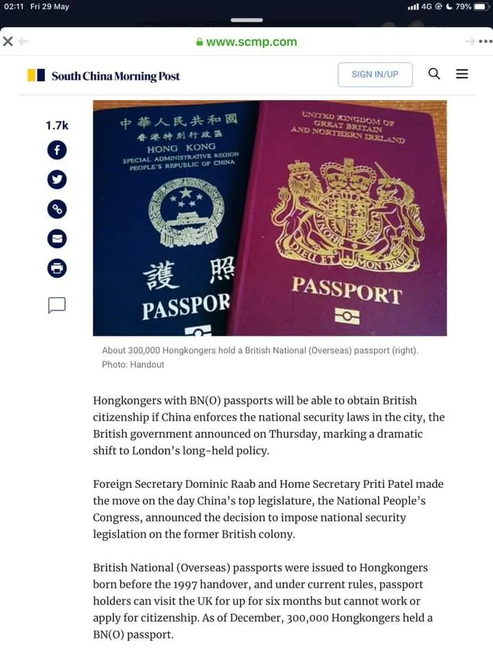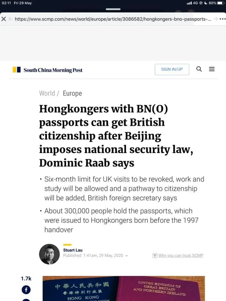 เฟซบุ๊กแฟนเพจ Thanong Fanclub โพสต์ข่าวจาก Sout China morning post ระบุว่า อังกฤษออกมาโปรยยาหอม ด้วยการประกาศว่าจะมอบสัญชาติBritishให้คนฮ่องกงที่ถือหนังสือเดินทาง British National Overseas จำนวน300,000กว่าคน