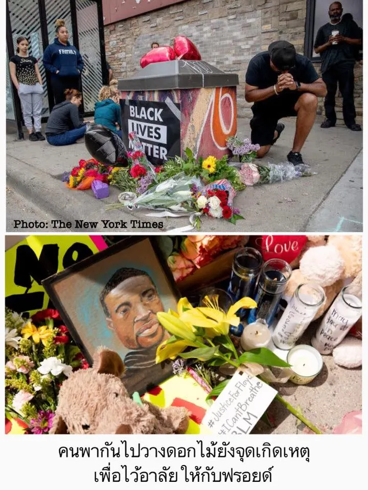 22- ในขณะเดียวกันผู้คนจำนวนมากก็พากันไปยังที่เกิดเหตุ เพื่อวางดอกไม้ ภาพวาด และจุดเทียนไว้อาลัยให้กับฟลอยด์