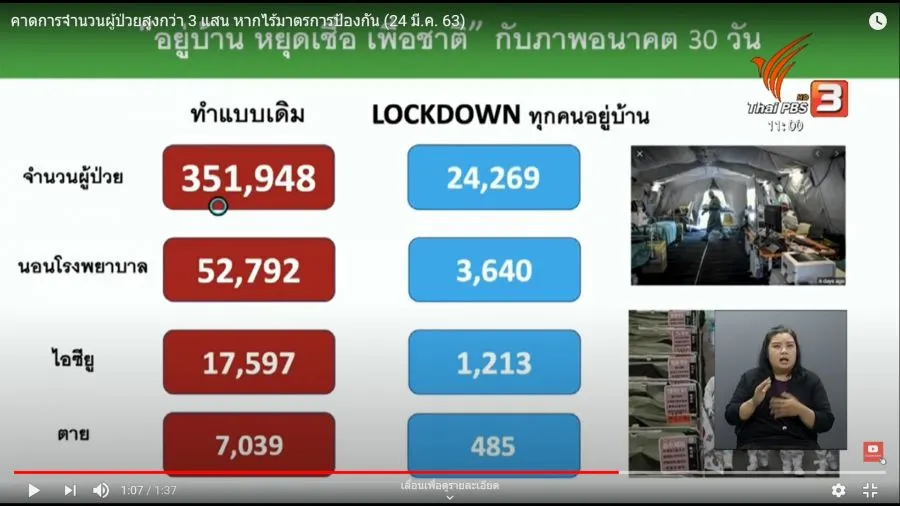 <1> คาดการจำนวนผู้ป่วยสูงกว่า 3 แสน หากไร้มาตรการป้องกัน (24 มี.ค. 63). https://www.youtube.com/watch?v=QI1W97HC1gw