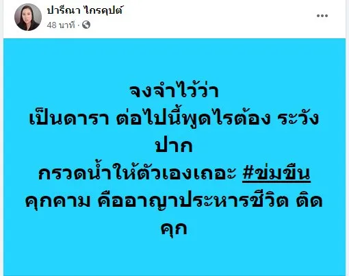 บุ๋มไม่เข้าใจว่า การที่บุ๋มออกมายืนหยัดต่อสู้ เพื่อผู้หญิง ที่ไม่มีปากไม่มีเสียงในสังคม มันทำให้คุณไม่พอใจด้วยเหตุใด ถึงต้องโพสต์โจมตีบุ๋มหลายต่อหลายครั้ง บุ๋มคงไม่ลดตัวไปแลก ด้วยการขุดเรื่องครอบครัว หรือสิ่งที่คุณเคยกระทำในอดีตกับผู้อื่น แต่ให้สังคมตัดสินแทนเองนะคะ
