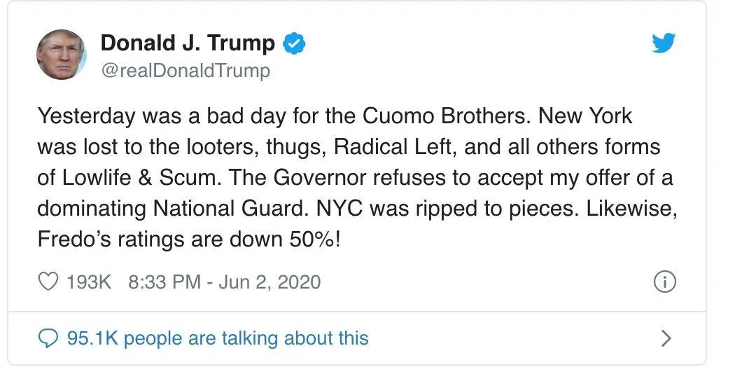 เป็นที่น่าสังเกตว่า ถ้อยคำทวีตของผู้นำสหรัฐฯยั่วยุให้เกิดสถานการณ์ความรุนแรงมากขึ้น เพื่อจะได้มีความชอบธรรมที่จะส่งทหารปราบปราม โดยวางตัวเองเป็นพระเอก ขณะเดียวกันก็กลบข่าวร้ายที่มีผู้ติดเชื้อโควิดตายเกินแสน และเศรษฐกิจย่อยยับ