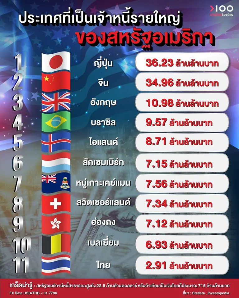 อายุน้อยร้อยล้าน เปิดเผยว่า หนี้สาธารณะรัฐบาลสหรัฐแตะเพดาน 22.5 ล้านล้านดอลลาร์ หรือ 715 ล้านล้านบาท โดยญี่ปุ่น เป็นเจ้าหนี้ที่ถือครองพันธบัตรรัฐบาลสหรัฐสูงที่สุด อยู่ที่ 36.23 ล้านล้านบาท ขณะที่จีนมียอดการถือครองพันธบัตรรัฐบาลสหรัฐอยู่ที่ 34.96 ล้านล้านบาท
