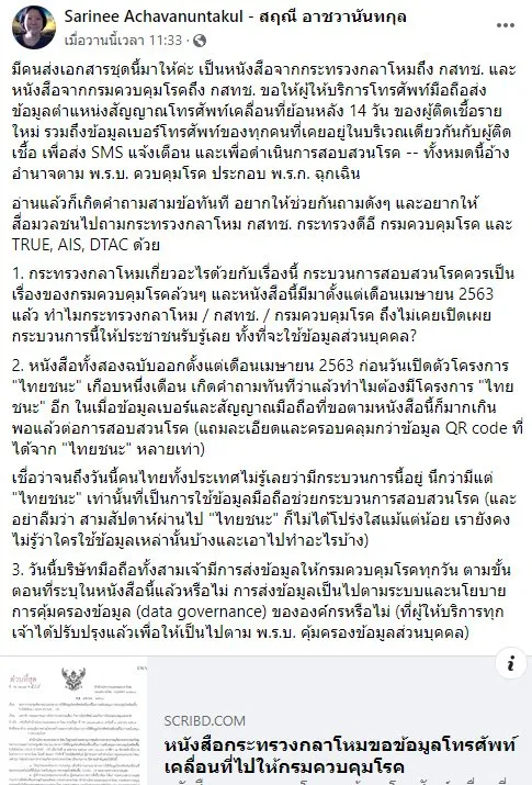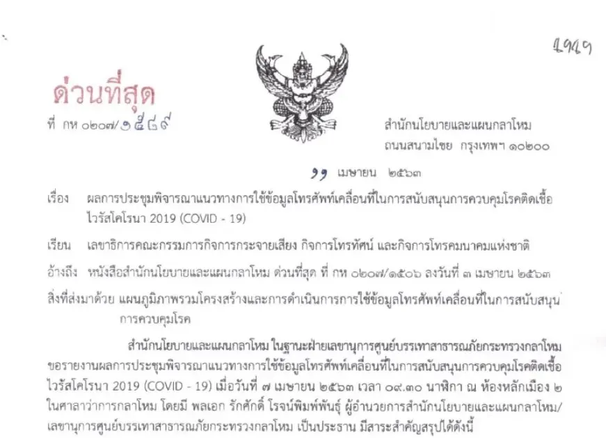 จากกรณีที่ น.ส.นางสาวสฤณี อาชวานันทกุล นักวิชาการอิสระด้านเศรษฐศาสตร์ เผยแพร่เอกสารของ สำนักนโยบายและแผนกลาโหม มีการขอข้อมูลโทรศัพท์เคลื่อนที่ในการสนับสนุนการควบคุมโรคติดเชื้อไวรัสโคโรนา 2019 นั้น