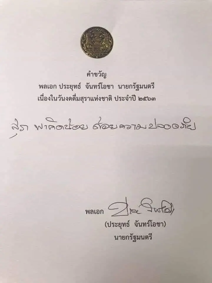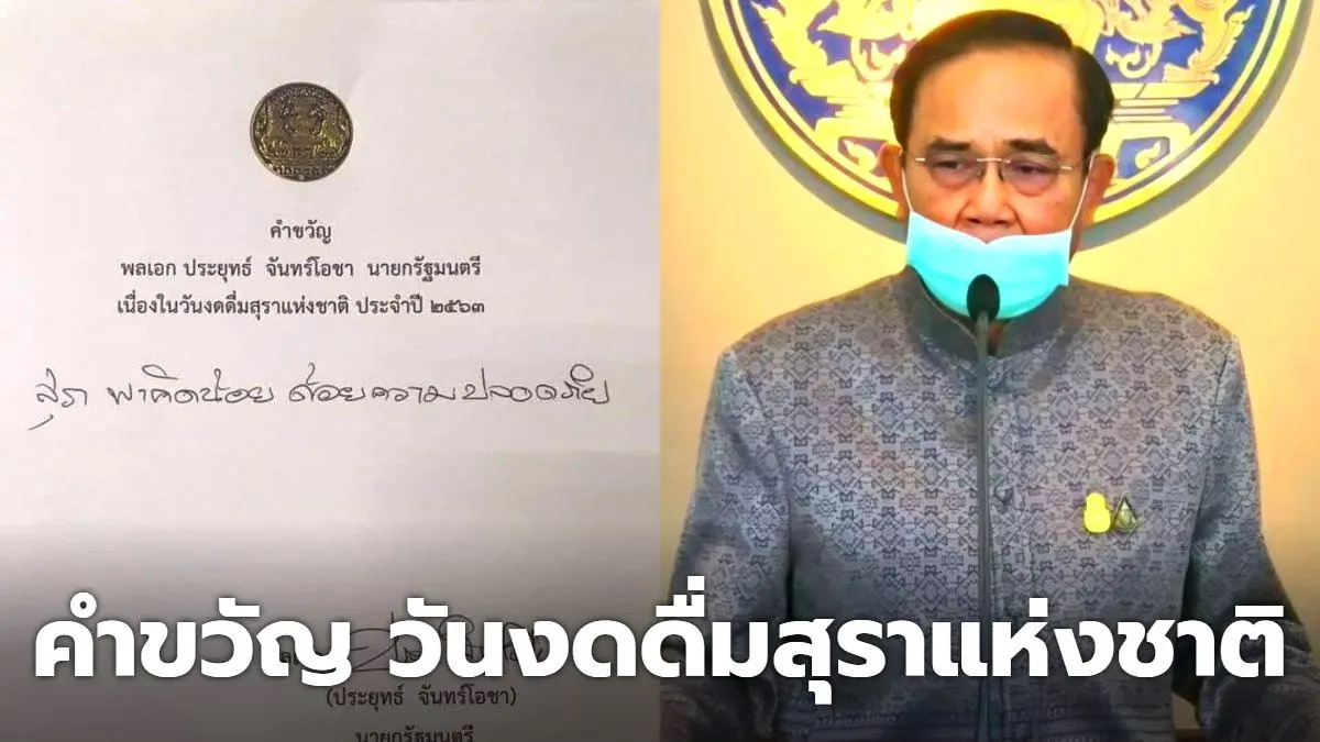 “พลเอก ประยุทธ์ จันทร์โอชา นายกรัฐมนตรี” มอบคำขวัญ วันงดดื่มสุราแห่งชาติ ประจำปี 2563 “สุราพาคิดน้อย ด้อยความปลอดภัย”