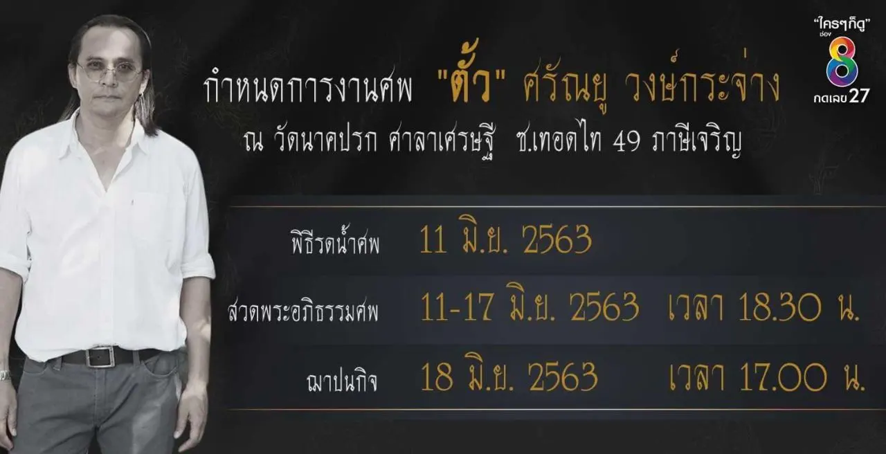 ครอบครัว "วงษ์กระจ่าง" แจ้งเรื่องงานศพ "ตั้ว" ศรัณยู วงษ์กระจ่าง"