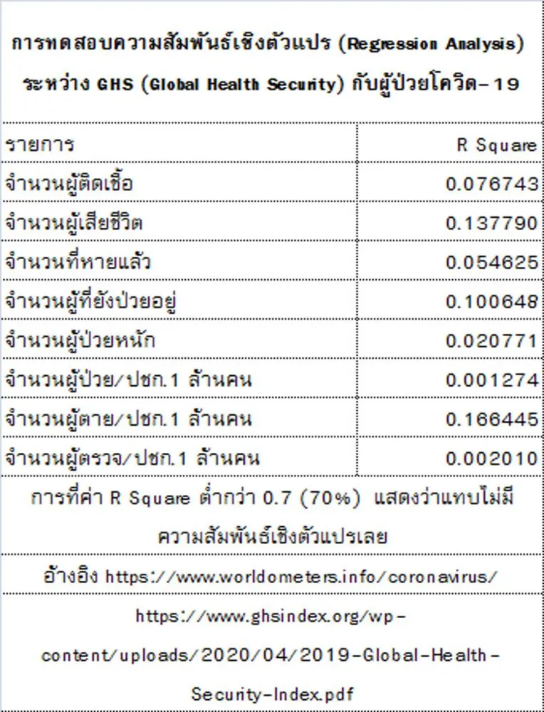 รายงานการศึกษาเรื่องการสาธารณสุขนี้ คือ Global Health Security Index (GHS) แต่ชุดข้อมูลนี้มีความน่าเชื่อถือเพียงใด ก็พิจารณาโดยเอาตัวเลข GHS Index นี้มาดูความสัมพันธ์เชิงตัวแปรด้วยการวิเคราะห์การถดถอยอย่างง่าย (Simple Regression Analysis) ทีละตัวแปรกับข้อมูลการติดเชื้อโควิด-19 มาเทียบกันดู