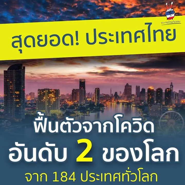 สุดยอด! ประเทศไทยเป็นประเทศที่ฟื้นตัวจากโควิดเป็นอันดับ 2 ของโลก จาก 184 ประเทศทั่วโลก