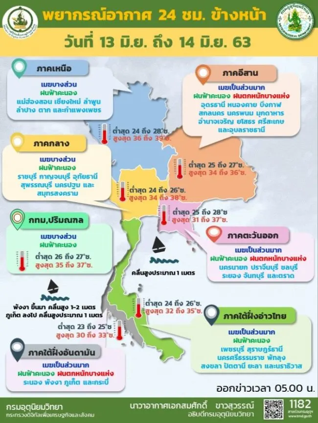กรมอุตุตนิยมวิทยา พยากรณ์อากาศ 24 ชั่วโมงข้างหน้า บริเวณภาคตะวันออกเฉียงเหนือ ภาคตะวันออก และภาคใต้ฝั่งตะวันตก มีฝนตกหนักบางแห่ง เนื่องจากมรสุมตะวันตกเฉียงใต้ ที่พัดปกคลุมทะเลอันดามันและประเทศไทยเริ่มมีกำลังแรงขึ้น