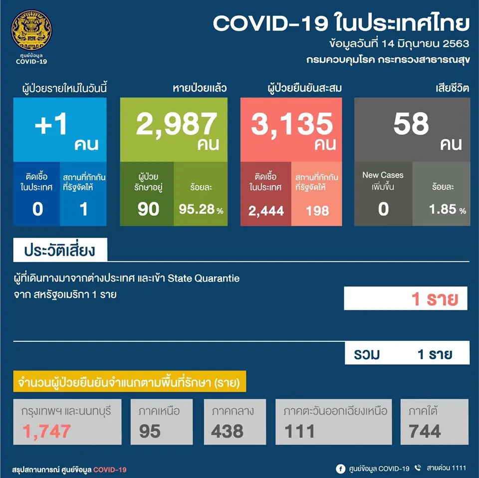 สธ.แถลงสถานการณ์การติดเชื้อ COVID-19 14 มิถุนายน 2563 พบติดเชื้อ 1 ราย (ติดเชื้อในประเทศ0)