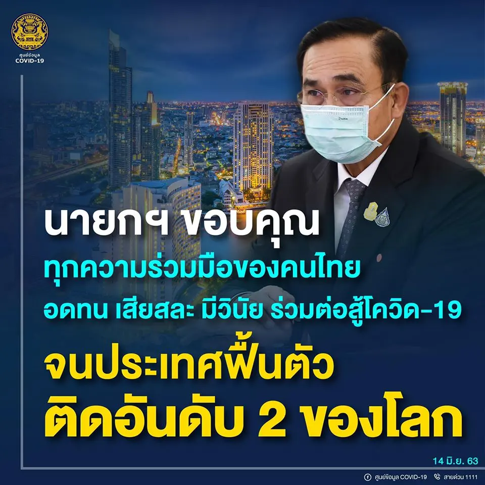 นายกฯ ขอบคุณคนไทยทุกคนร่วมต่อสู้ไวรัสโควิด-19 จนประเทศ "ฟื้นตัวดีสุด" ติดอันดับ 2 ของโลก