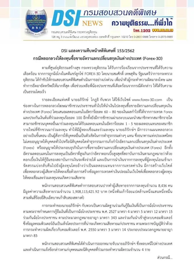 กรณีหลอกลวงให้ลงทุนซื้อขายอัตราแลกเปลี่ยนสกุลเงินต่างประเทศ (Forex-3D) #DSI_PR