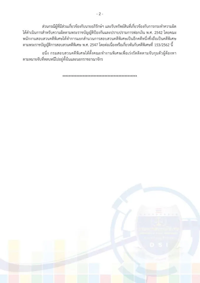 อนึ่ง กรมสอบสวนคดีพิเศษได้ตั้งคณะทำงานพิเศษเพื่อเร่งรัดติดตามจับกุมตัวผู้ต้องหา