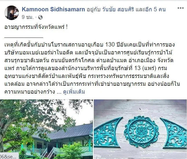 สว.คำนูณ สิทธิสมาน โพสต์ในเฟสบุค เกี่ยวกับการรื้ออาคารเก่า ตึก บอมเบย์เบอร์มา อายุ 120 ปี เมืองแพร่ มีข้อความว่า..