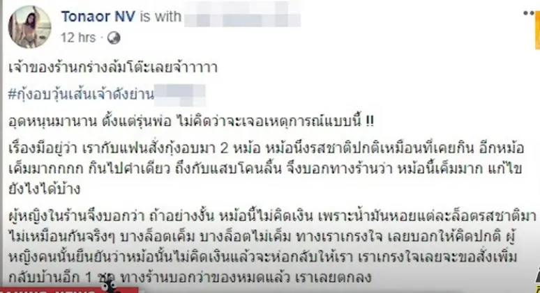 เฟซบุ๊ก Tonaor NV โพสต์ กรณีร้านอาหาร กุ้งอบวุ้นเส้นชื่อดัง วันที่ 20 มิย.63 เล่าเรื่องราวการกินกุ้งอบวุ้นเส้นที่ร้านอาหารแห่งหนึ่ง โดยร้านนี้เป็นร้านเก่าแก่ เธอนั้นเริ่มกินมาตั้งแต่รุ่นพ่อ ด้านผู้หญิงในร้าน ก็แก้ไขปัญหาด้วยวิธีการไม่คิดเงินหม้อที่เค็ม น้ำมันหอยแต่ละล็อต รสชาติมาไม่เหมือนกัน