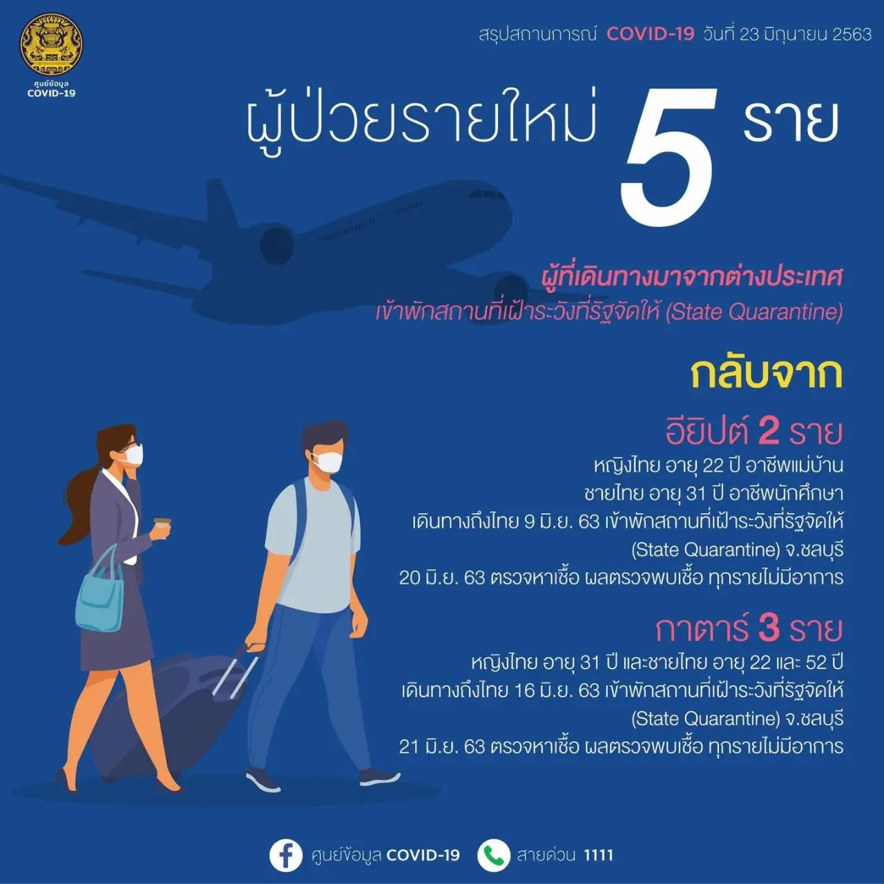 23 มิถุนายน 2563 (วันนี้) ศบค.แถลงพบผู้ป่วยรายใหม่ 5 ราย เป็นคนไทยที่เดินทางมาจากต่างประเทศ เข้าพักสถานที่เฝ้าระวังที่รัฐจัดให้ (State Quarantine) โดยมาจากอียิปต์ 2 ราย และจากกาตาร์ 3 ราย