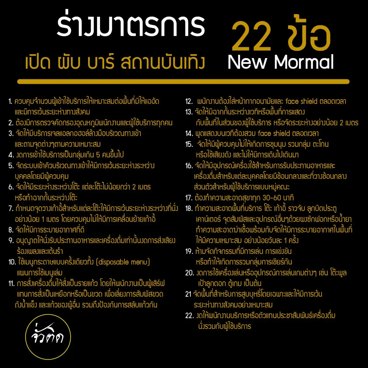 มีรายงานว่า คณะกรรมการเฉพาะกิจพิจารณาการผ่อนปรนการบังคับใช้มาตรการในการป้องกันและยับยั้งการแพร่ระบาดของโรคติดเชื้อไวรัสโคโรนา 2019 เตรียม (ร่าง) มาตรการ เสนอศูนย์บริหารสถานการณ์การแพร่ระบาดของโรคติดเชื้อไวรัสโคโรนา 2019 (โควิด-19) หรือ ศบค. สำหรับการเปิดสถานบริการผับ บาร์ รวม 22 มาตรการ คือ