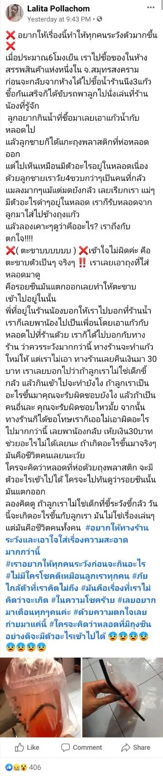 ใครจะคิดว่าหลอดที่ห่อด้วยถุงพลาสติก จะมีตัวอะไรเข้าไปได้ ใครจะไปทันดูว่ารอยซีนนั้นมันแตกออก ลองคิดดู ถ้าลูกเราไม่ใช่เด็กที่ขี้ระวังขี้กลัว วันนี้จะเกิดอะไรขึ้นกับลูกเรา มันไม่ใช่เรื่องเล่นๆ แต่มันคือชีวิตคนทั้งคน #อยากให้ทางร้านระวังและเอาใจใส่เรื่องความสะอาดมากกว่านี้