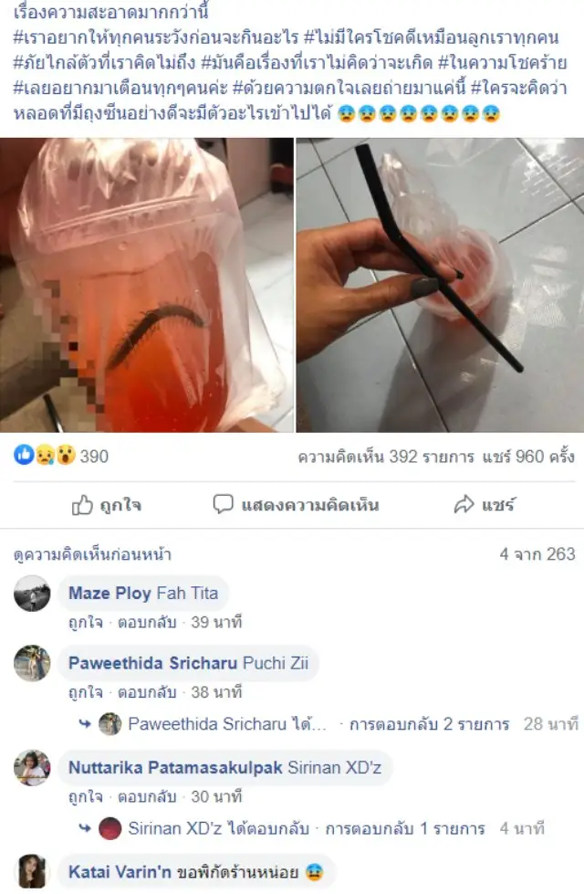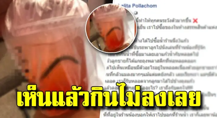 เฟซบุ๊ก Lalita Pollachom โพสต์ภาพและข้อความเตือนภัยว่า ตนเองได้ซื้อน้ำจากร้านแห่งหนึ่งในห้างสรรพสินค้าแห่งหนึ่งใน จ.สมุทรสงคราม จากนั้นได้ขับรถพาลูกไปนั่งเล่นที่ร้านน้องที่รู้จัก ลูกอยากกินน้ำที่ซื้อมาเลยเอาแก้วน้ำกับหลอดไป