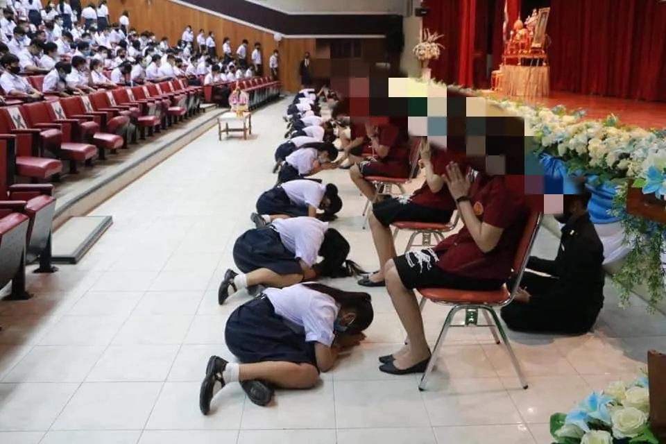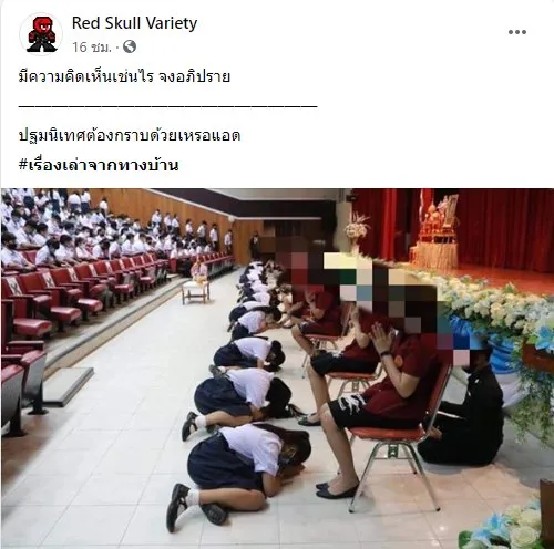 จากกรณีเพจเฟสบุ๊ค Red Skull Variety โพสต์เรื่องร้องเรียนมาจากลูกเพจ สำหรับเหตุการณ์ที่เกิดขึ้นในโรงเรียนแห่งหนึ่งที่จัดกิจกรรมปฐมนิเทศ ซึ่งจากในภาพจะเห็นได้ว่ามีการให้นักเรียนหมอบกราบแทบเท้าอาจารย์ จนเกิดเสียงวิพากษ์วิจารณ์จากชาวเน็ตกันเป็นจำนวนมาก