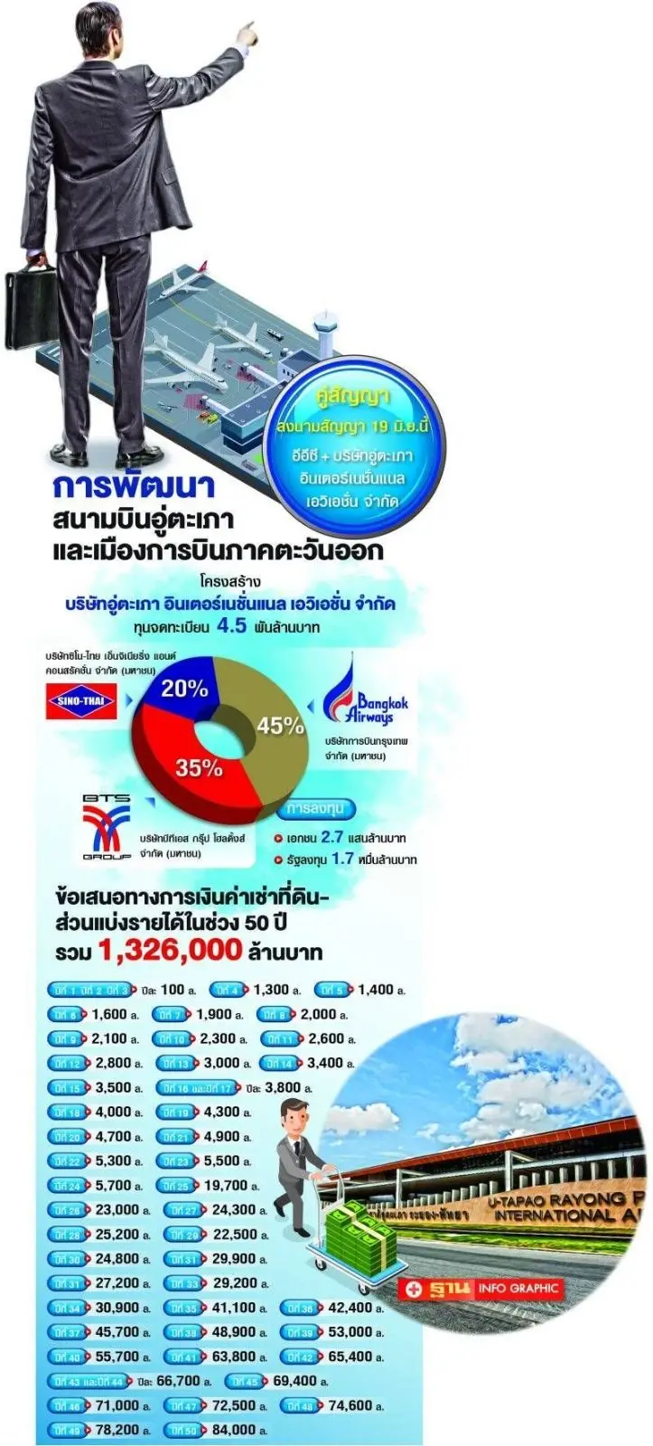 ผ่านไปแล้วด้วยความชื่นมื่นกับการลงนามในสัญญาโครงการพัฒนาสนามบินอู่ตะเภาและเมืองการบินภาคตะวันออก ระหว่างกองทัพเรือและสำนักงานคณะกรรมการนโยบายเขตพัฒนาพิเศษภาคตะวันออก (อีอีซี) กับเอกชนคู่สัญญา บริษัท อู่ตะเภา อินเตอร์เนชั่นแนล เอวิเอชั่น จำกัด ประกอบด้วย บริษัท การบินกรุงเทพ จำกัด (มหาชน) ถือหุ้น 45% บริษัท บีทีเอส กรุ๊ป โฮลดิ้ง จำกัด (มหาชน) ถือหุ้น 35% และ บริษัท ซิโน-ไทย เอ็นจีเนียริ่ง แอนด์ คอนสตรัคชั่น จำกัด (มหาชน) ถือหุ้น 20%