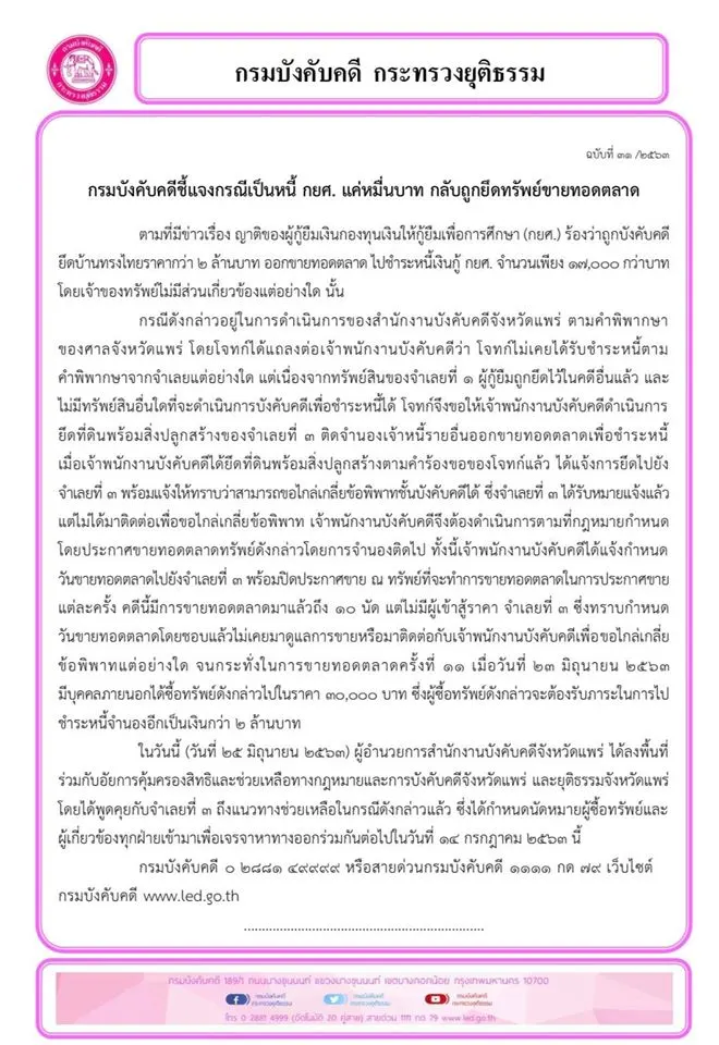 กรมบังคับคดีแจงกรณีสาวแพร่เป็นหนี้ กยศ.1.7 หมื่นบาท แต่ถูกยึดบ้านของพ่อราคา 2 ล้าน