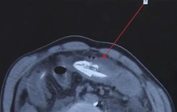 อย่างไรก็ตาม ทีมแพทย์ได้ทำการ CT Scan เพื่อหาสาเหตุของความเจ็บป่วยของชายอายุ 50 ปี เนื่องจากเมื่อมาถึงโรงพยาบาลเขามีภาวะติดเชื้อรุนแรง จนนำไปสู่ภาวะช็อก และไม่สามารถสื่อสารกับแพทย์ได้ และในระหว่างการ CT Scan แพทย์ได้ตั้งข้อสงสัยว่า อาจมีสิ่งแปลกปลอมอยู่ในช่องท้องของผู้ป่วยรายนี้ แต่ก็ไม่สามารถบอกได้ว่ามันคืออะไร