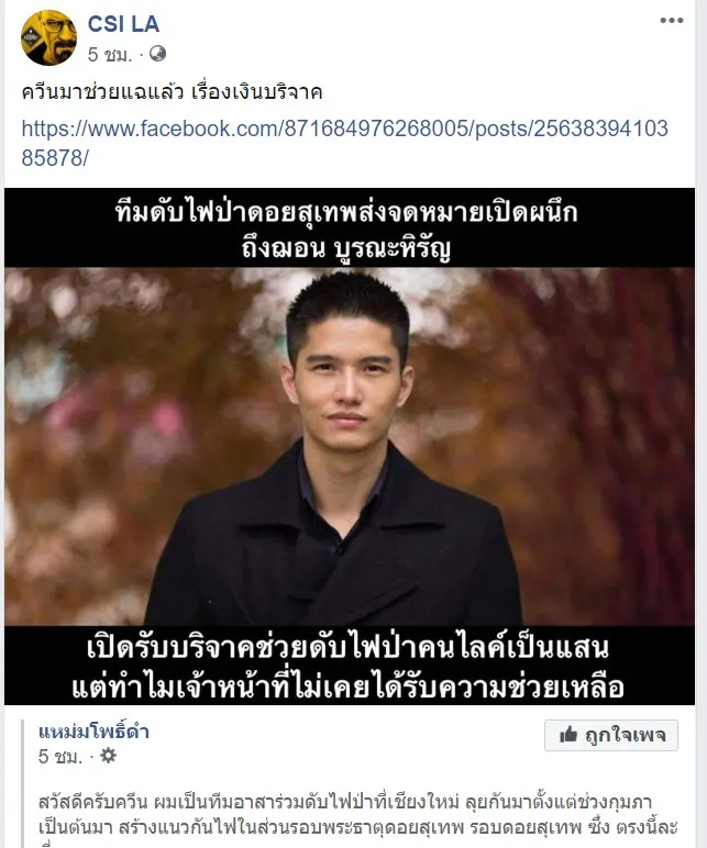 จากข่าว ทีมดับไฟป่าดอยสุเทพร้อง'เพจแหม่โพธิ์ดำ' อ้าง 'ฌอน'เปิดรับบริจาคช่วยไฟป่า แต่จนท.ไม่เคยได้รับการช่วยเหลือ?