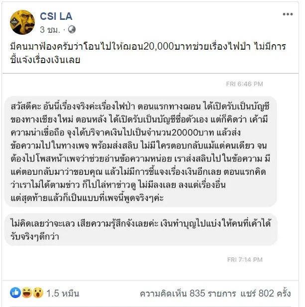 เพ จCSI LA โพสต์ข้อความจากแชทอ้างว่า ..."มีคนมาฟ้องครับว่าโอนไปให้ฌอน20,000บาทช่วยเรื่องไฟป่า ไม่มีการชี้แจ้งเรื่องเงินเลย"