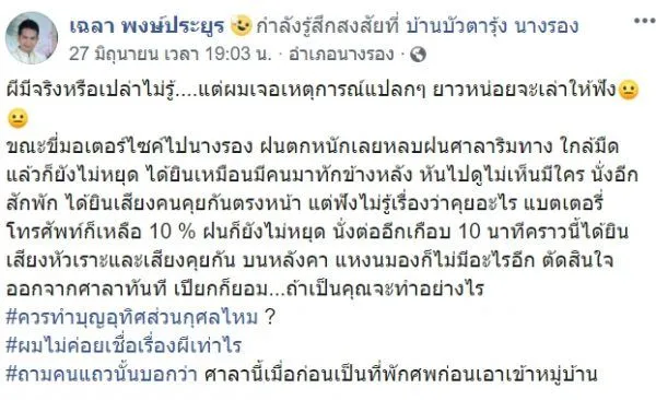 รองสารวัตรป้องกันปราบปราม สภ.นางรอง จ.บุรีรัมย์ ได้โพสต์ภาพพร้อมข้อความบอกเล่าเรื่องราวชวนขนหัวลุก ผ่านเฟซบุ๊กส่วนตัวชื่อ “เฉลา พงษ์ประยูร” หลังตนเองเข้าไปจอดรถจักรยานยนต์หลบฝนอยู่บริเวณศาลาริมทางแห่งหนึ่ง