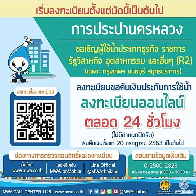 กปน. เปิดลงทะเบียน ขอคืนเงินประกัน การใช้น้ำประเภท ธุรกิจ ราชการ รัฐวิสาหกิจ อุตสาหกรรมและอื่น ๆ (R2) เกือบ 6แสนราย พร้อมเริ่มคืนเงินตั้งแต่ 20 ก.ค.นี้ นายปริญญา ยมะสมิต ผู้ว่าการการประปานครหลวง (กปน.) เปิดเผยว่า ตั้งแต่บัดนี้เป็นต้นไป กปน. เปิดให้ลงทะเบียนขอคืนเงินประกันการใช้น้ำสำหรับผู้ใช้น้ำประเภทธุรกิจ ราชการ รัฐวิสาหกิจ อุตสาหกรรมและอื่น ๆ