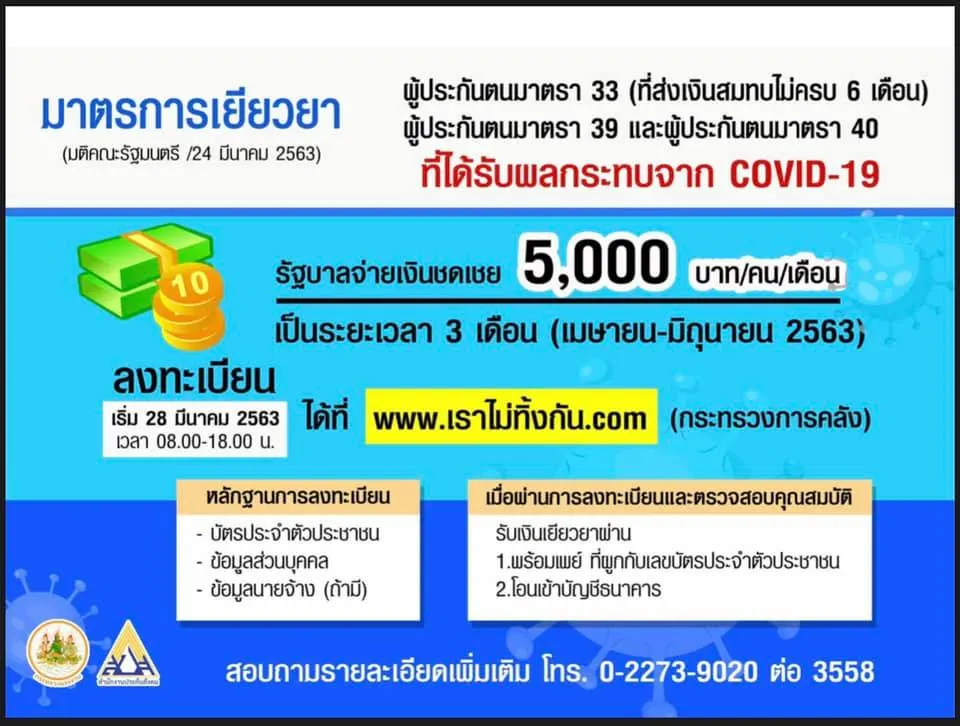 ทั้งนี้ ผู้ประกันตน ม.39 ม.40 และผู้ประกันตน ม.33 ที่ส่งเงินสมทบยังไม่ครบ 6 เดือน ที่ได้รับผลกระทบจากโรคโควิด-19 ก็สามารถลงทะเบียนเพื่อรับเงินชดเชยรายได้ 5,000 บาทต่อเดือน เป็นเวลา 3 เดือน เมย มิย 63 ได้เช่นกัน โดยผู้ประกันตนต้องลงทะเบียนผ่านเว็บไซต์ www.เราไม่ทิ้งกัน com ตั้งแต่วันนี้ 28 มี.ค 63 เวลา 18.00 น. เป็นต้นไป พร้อมแนบหลักฐาน คือ บัตรประจำตัวประชาชน ข้อมูลส่วนบุคคล ข้อมูลนายจ้าง ถ้ามี