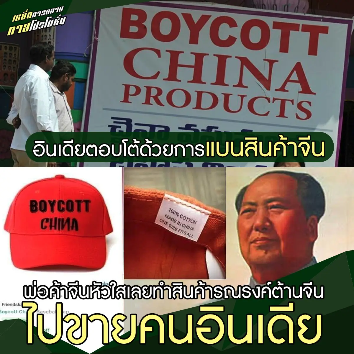 เพจเหยื่อการตลาด ทาสโปรโมชั่น ได้รายงานข่าว อินเดียอินเดียบอยคอตต์สินค้าจีน รวมถึงแอพพลิเคชั้นของจีน และสนับสนุนสินค้าท้องถิ่นอินเดีย แต่พ่อค้าจีน พลิกวิกฤต ให้เป็นโอกาส ผลิต เสื้อยืด ซื้อหมวก แคมเปญ “Boycott China” ซะเลย!