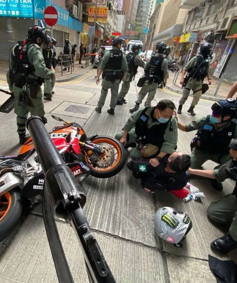 ม็อบฮ่องกงวัย 23 ปี ซึ่งขับจักรยานยนต์พุ่งชนตำรวจฮ่องกง ถูกจับกุมและดำเนินคดีฐานก่อการร้าย ถือเป็นผู้ต้องหาคนแรกที่พนักงานสอบสวนดำเนินคดีตามกฎหมายความมั่นคงแห่งชาติ ซึ่งเพิ่งมีผลบังคับใช้
