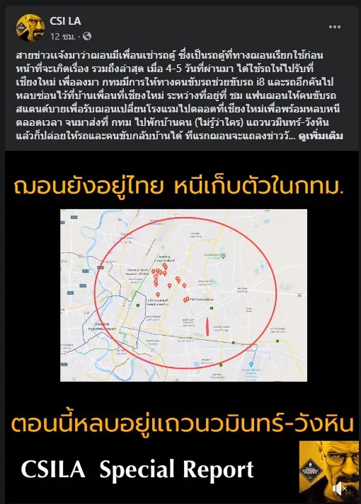 เพจดัง CSI LA เผย “ฌอน” ตอนนี้อยู่ในไทย ใช้ชีวิตราวอาชญากร พร้อมหลบหนีตลอดเวลา. มีคนเช่ารถตู้แอบไปรับที่เชียงใหม่พาเข้ากรุงเทพฯ พักบ้านคนอื่นแถวนวมินทร์-วังหิน และได้นำรถหรูหลายคันไปซุกบ้านเพื่อนแก๊งเดียวกันที่เชียงใหม่ สืบทราบ เคยมีแผนแถลงข่าววันอาทิตย์ แต่เปลี่ยนใจ ไม่รู้มีผู้ใหญ่(ใคร?)ห้ามไว้หรือไม่
