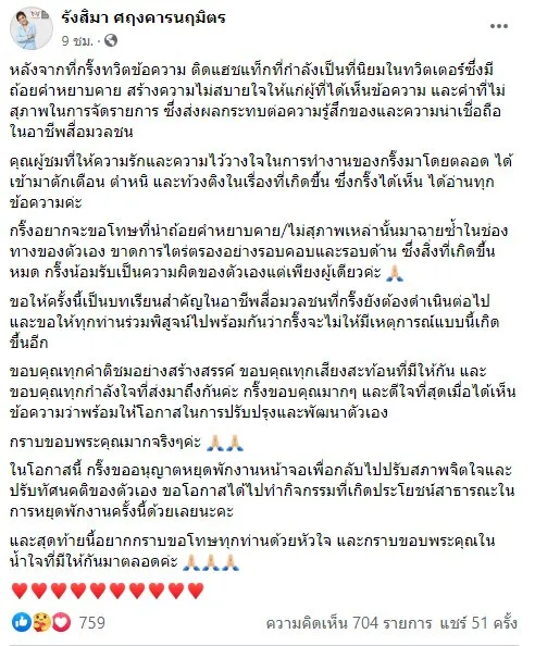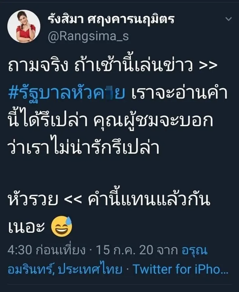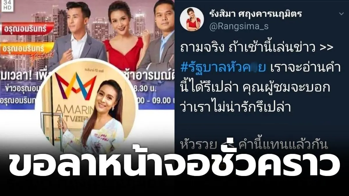 นางรังสิมา ศฤงคารนฤมิตร ผู้ประกาศข่าวสถานีโทรทัศน์อมรินทร์ทีวี ช่อง 34 ตัดสินใจพักงานชั่วคราว หลังถูกผู้สนับสนุนรัฐบาล พล.อ.ประยุทธ์ จันทร์โอชา แสดงความไม่พอใจที่เจ้าตัวโพสต์ข้อความโดยติดแฮชแท็ก “รัฐบาลส้นTeenคนเชียร์ก็ส้นTeen” และ “รัฐบาลหัว...” @rangsima_s