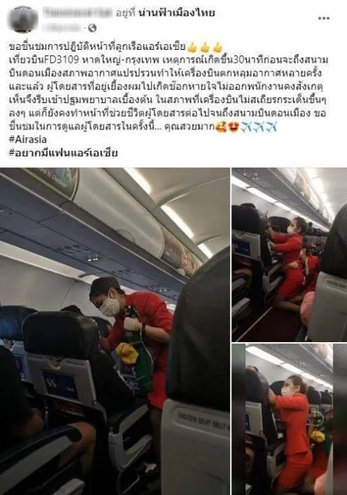 โดยผู้โพสต์ระบุว่า ขอชื่นชมการปฎิบัติหน้าที่ลูกเรือแอร์เอเชีย เที่ยวบิน FD3109 หาดใหญ่-กรุงเทพ เหตุการณ์เกิดขึ้น 30 นาทีก่อนจะถึงสนามบินดอนเมือง สภาพอากาศแปรปรวน ทำให้เครื่องบินตกหลุมอากาศหลายครั้ง และแล้วผู้โดยสารที่อยู่เยื้องผมไปเกิดช็อก หายใจไม่ออก พนักงานคงสังเกตเห็นจึงรีบเข้าปฐมพยาบาลเบื้องต้น ในสภาพที่เครื่องบินไม่เสถียร กระเด็นขึ้นๆลงๆ แต่ก็ยังคงทำหน้าที่ช่วยชีวิตผู้โดยสารต่อไปจนถึงสนามบินดอนเมือง