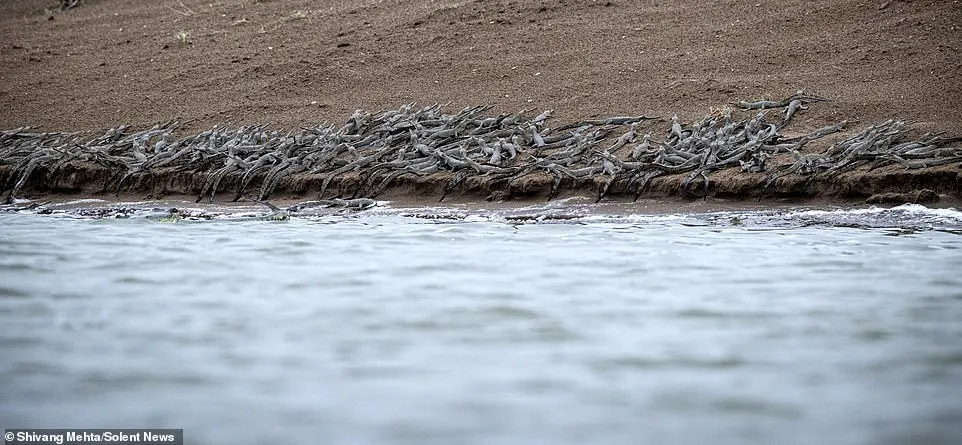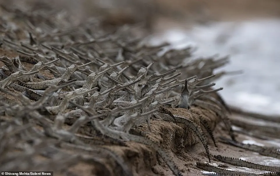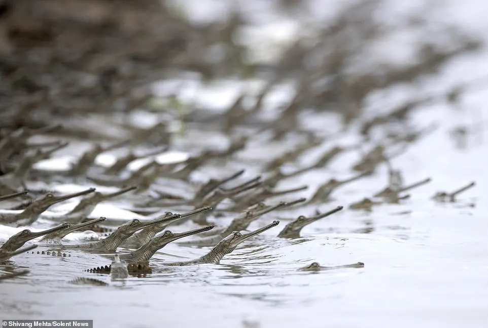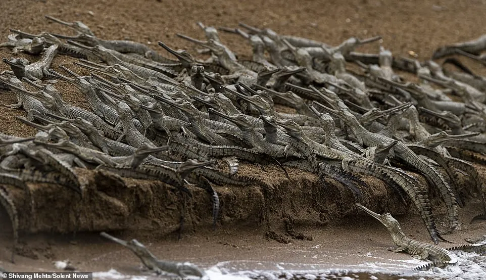 ละลานตา! ลูกตะโขงอินเดียหลายร้อยตัว นอนเรียงตัวเหมือนกองทัพเล็ก ๆ ริมฝั่งแม่น้ำในอินเดีย