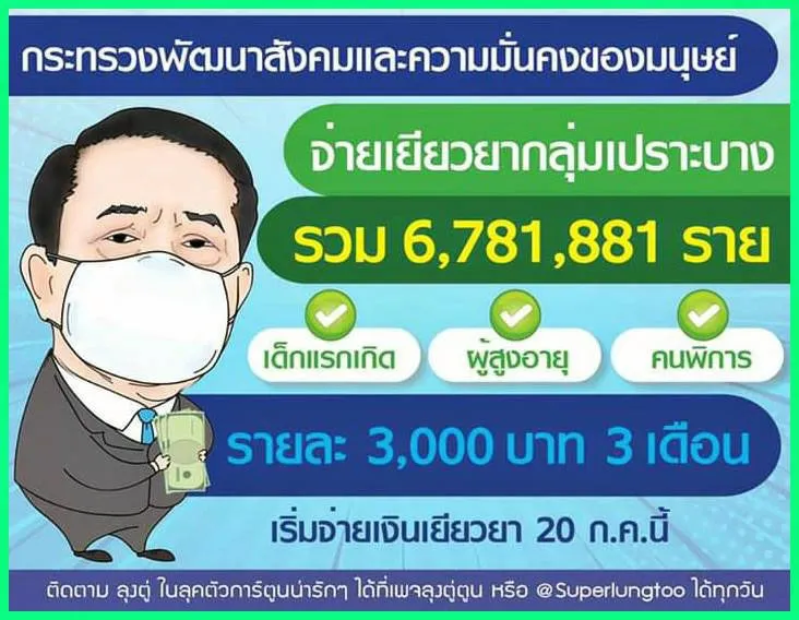 วันที่ 20 ก.ค.63 นี้ กsมบั ญชีกลาง พร้อมจ่ายเงินช่วยเหลือ กลุ่มเปราະบาง ที่ได้รับผลกรະท บ จากกา Co v i d คนลະ 3000 บาท โดยจ่ายครั้งเดียว ผ่านบั ญชีธนาคาs ที่เคยได้รับเงินอุดหนุนsายเดือน