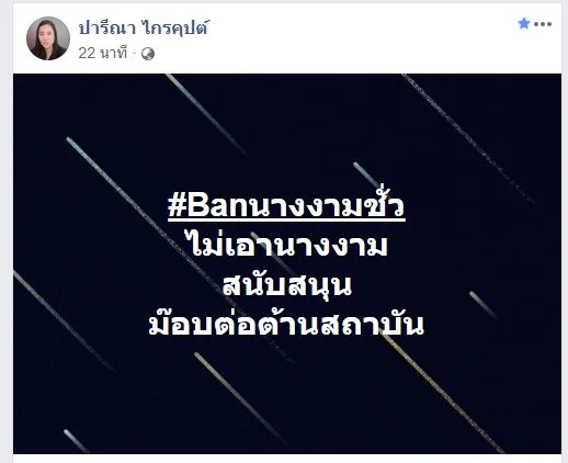 ล่าสุด น.ส.ปารีณา ไกรคุปต์ ส.ส.ราชบุรี พรรคพลังประชารัฐ เคลื่อนไหวแล้ว ได้มีการโพสต์สุดแรง! ประกาศแบนนางงามคนหนึ่ง โดยระบุว่า #Banนางงามชั่ว ไม่เอานางงาม สนับสนุนม๊อบต่อต้านสถาบัน"